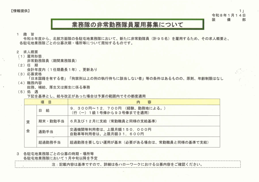 1月 16 2026 オフ 業務隊の非常勤務隊員雇用募集についての情報提供 投稿者: 恵庭支部連合会 表記について添付資料の通り連絡があったのでお知らせします。 投稿ナビゲーション 過去の投稿前 令和7年度北海道隊友会連合会ブロック会議